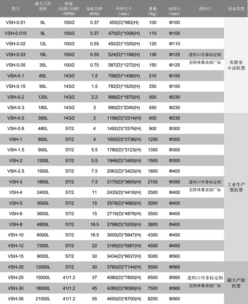 設(shè)備規(guī)格:0.01m3~30m3;單批次處理體積范圍:6L~18m3;單批次處理重量范圍:3kg~20噸(tons);材質(zhì)選擇:不銹鋼304,316L,321,304L,碳鋼,錳鋼,其他指定材質(zhì);適用物料類(lèi)型:粉體+粉體、粉體+液體(少量)的混合;